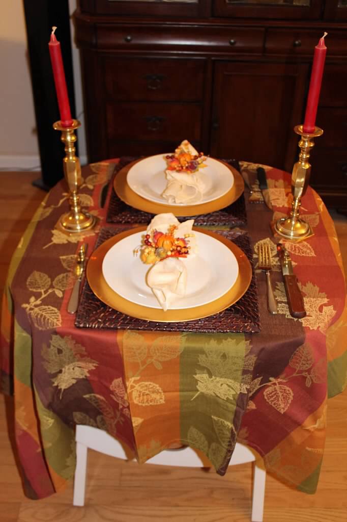 I had also bought a new tablecloth with embroidered gold leaves on it, very pretty! A few years ago I had gotten 2 pairs of autumn-inspired crackle glass votive candles from Yankee Candle and thought they would go perfect with this tablescape.